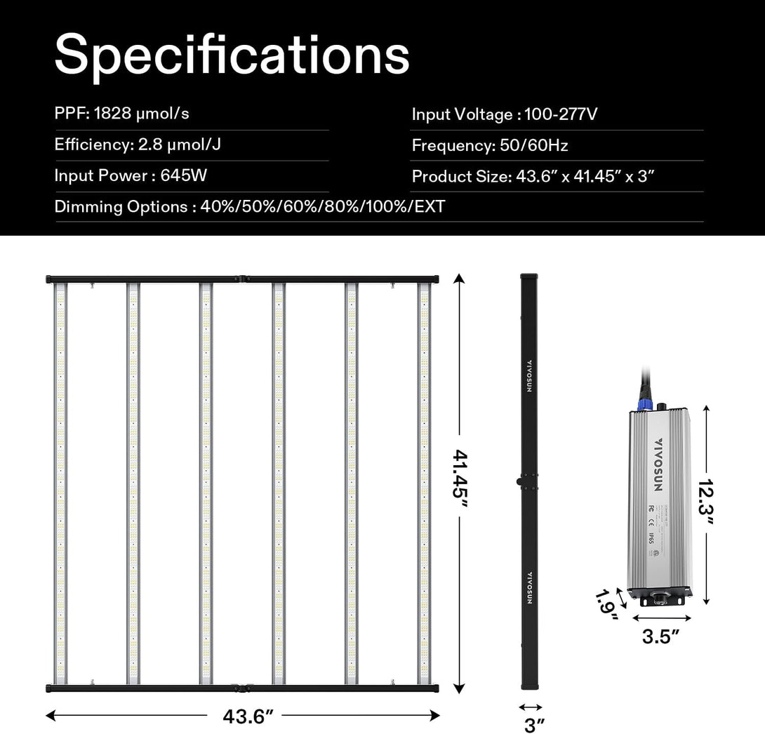 - High Efficiency & Uniformity: This grow light boasts significantly higher PPFD compared to equivalent HID lights, featuring an enhanced conversion efficiency of 2.8μmol/J; The uniform and dense PAR map ensures deeper light penetration, thereby promoting plant health; This is achieved with a power consumption of only 645W.